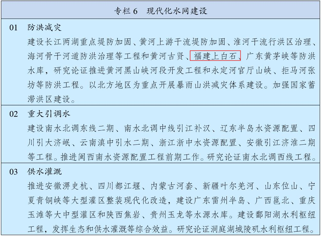 近日,新华社受权发布《中华人民共和国国民经济和社会发展第十五个五年规划纲要》,福建上白石水利枢纽工程从“十四五”规划纲要接转列入“十五五”规划纲要现代化水网建设防洪减灾工程项目清单。