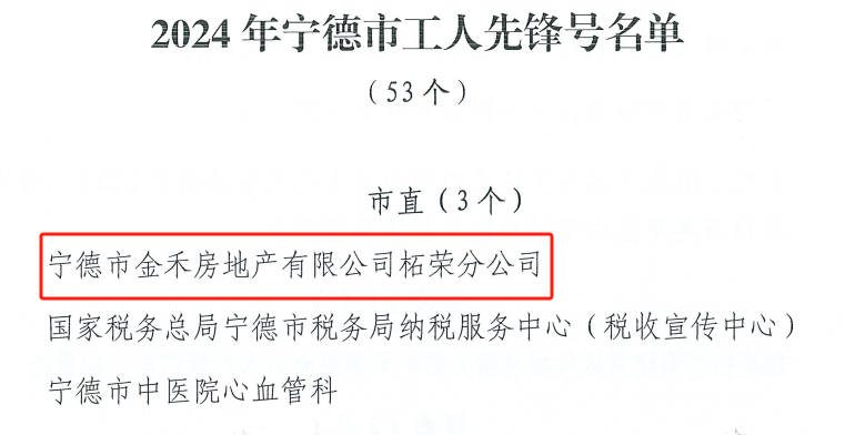 近日,根据《宁德市总工会关于命名2024年度宁德市工人先锋号、表扬2024年度宁德市金牌工匠、数字工匠的通知》(宁工〔2025〕4号)文件,糖心vlog 下属企业宁德市金禾房地产有限公司柘荣分公司凭借在房地产领域的积极贡献,被评定为2024年宁德市“工人先锋号”。