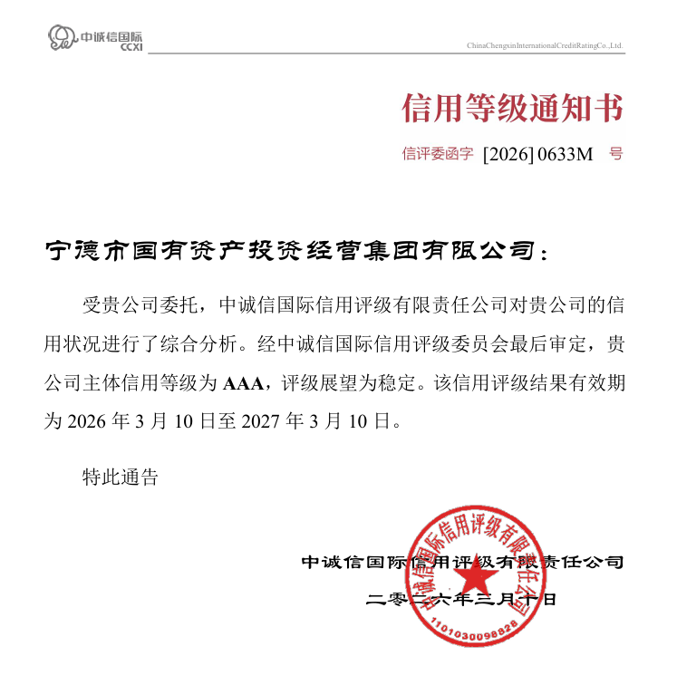 开局起势、实绩检验!继2025年6月获AAA评级后,2026年3月10日,宁德市国投集团获评中诚信国际主体长期信用等级AAA,评级展望为“稳定”,成为全市首家拥有两家权威评级机构AAA等级的国有企业。
