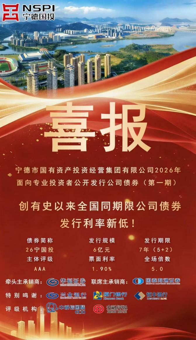 宁德市国投集团2026年度第一期小公募公司债券,募集资金6亿元,期限5+2年,票面利率1.90%,全场认购倍数5倍,创下有史以来全国同期限公司债券发行利率新低!
